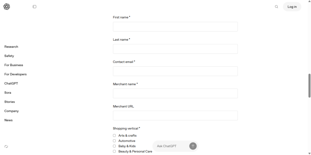 OpenAI provides an interest form where you can sign up to be notified when merchant product feed submissions go live. You can find it on their “Help ChatGPT discover your products” page.
